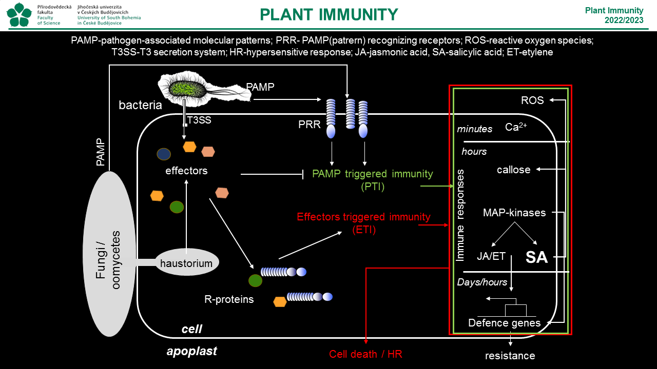 The aim of the course is to introduce students to the basics of plant interactions with microorganisms (mostly pathogens) with emphasis on plant immunity. Students will briefly learn both the macroscopic consequences of plant-microorganism interactions and, in particular, the molecular processes involved in plant immunity. At the same time, practical implications (applications) of knowledge of plant immunity will be introduced. The course also includes exercises in which students will be introduced to basic techniques for the analysis of plant immune responses (genotyping - DNA isolation, PCR, electrophoresis; inhibition of seedling growth, measurement of reactive oxygen species, analysis of plant infection by bacteria, analysis of callose formation). Students will use these techniques to analyse different genotypes of Arabidopsis thaliana.